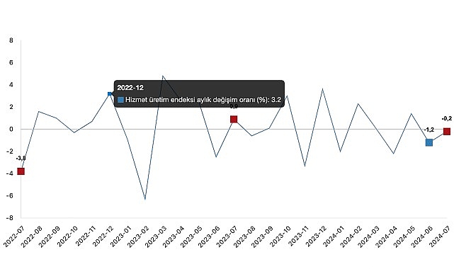 Hizmet üretim endeksi (2021=100) 2024 yılı Temmuz ayında bir evvelki aya nazaran %0,2 azaldı. Birebir ayda ulaştırma ve depolama hizmetleri %0,1 arttı, konaklama ve yiyecek hizmetleri %0,3 azaldı, bilgi ve irtibat hizmetleri %1,0 azaldı, gayrimenkul hizmetleri %3,5 arttı, mesleksel, bilimsel ve teknik hizmetler %2,4 azaldı, idari ve dayanak hizmetleri ise %0,1 arttı.