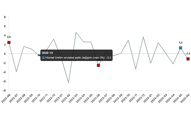 Hizmet üretim endeksi (2021=100) 2024 yılı Haziran ayında bir evvelki aya nazaran %1,1 azaldı. Tıpkı ayda ulaştırma ve depolama hizmetleri %2,6 azaldı, konaklama ve yiyecek hizmetleri %1,9 azaldı, bilgi ve bağlantı hizmetleri %3,0 arttı, gayrimenkul hizmetleri %4,2 azaldı, mesleksel, bilimsel ve teknik hizmetler %0,7 arttı, idari ve takviye hizmetleri ise %0,6 arttı.